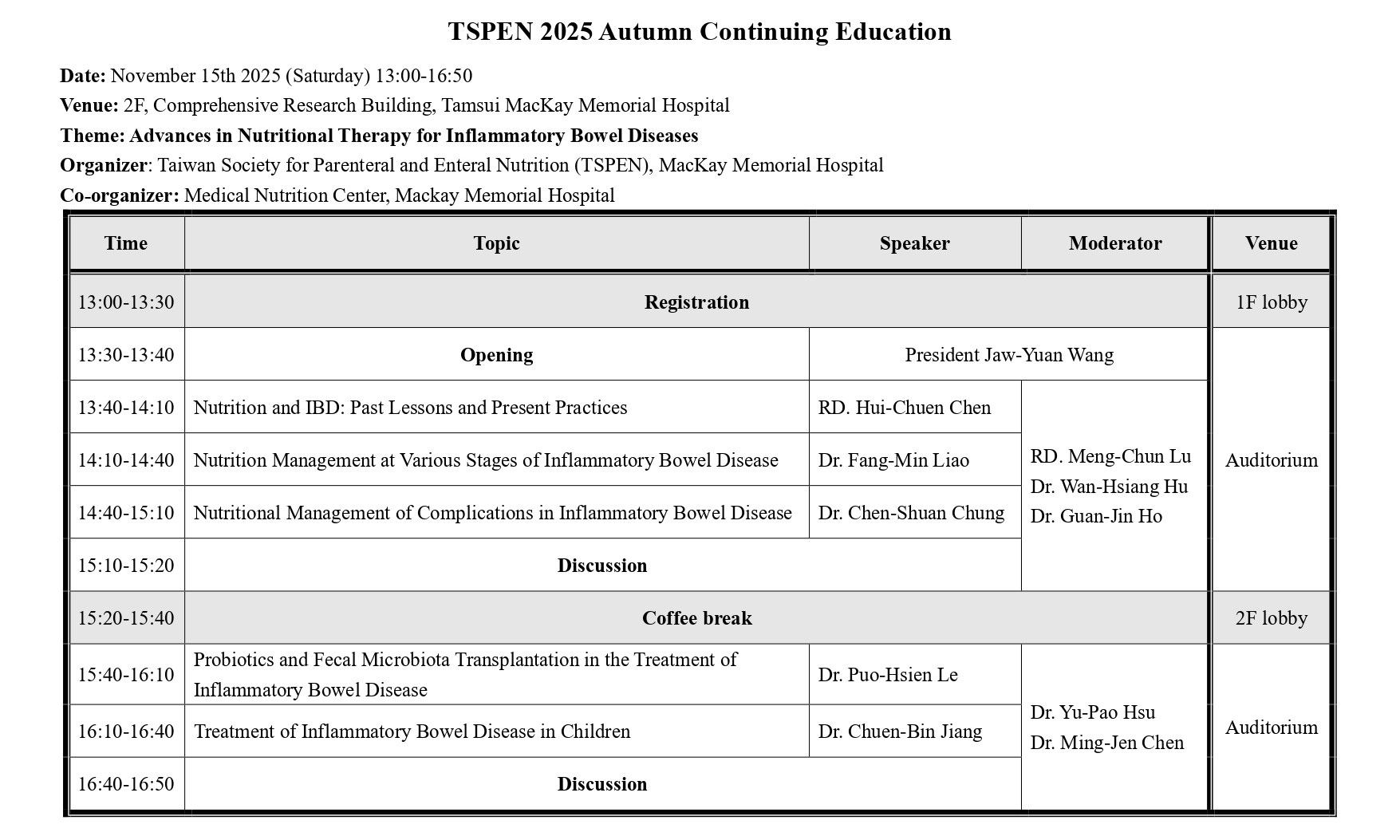 本學會謹訂於 114年11月15日(六) 假 淡水馬偕紀念醫院綜合研究大樓二樓 舉行 114年度秋季繼續教育課程,主題為「發炎性腸道疾病的營養治療進展」,此次會議邀請到多位國內外營養專家蒞臨指導,給予營養新知與臨床實務經驗分享。敬請各位會員踴躍參加。