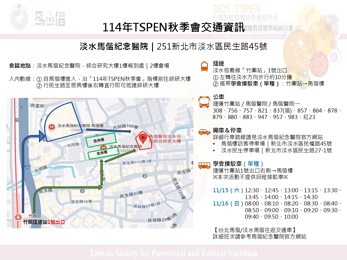 9. 交通資訊:請見下方檔案(交通指引-114年TSPEN秋季會)。詳細請參閱馬偕紀念醫院官方網站 https://www.mmh.org.tw/webpage.php?id=40