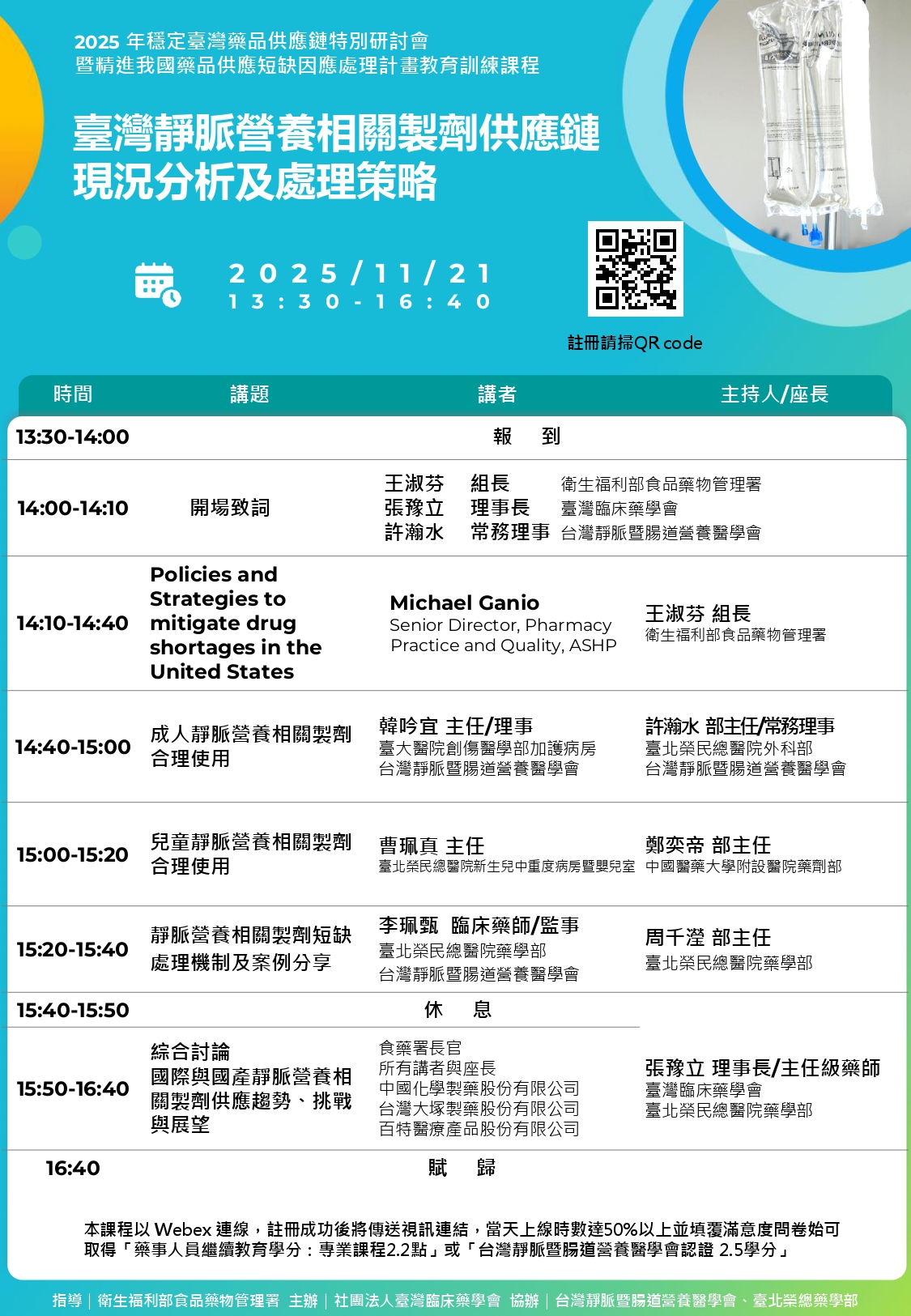 學術活動 首頁 / 學術活動 / 國內學術活動 行事曆 國內學術活動 國外學術活動 國際學術研討會補助辦法 活動報名 論文投稿 線上資源區 影音學習專區 國內學術活動 臺灣靜脈營養相關製劑供應鏈現況分析及處理策略 活動日期: 2025/11/21 13:30 ~ 2025/11/21 16:40 活動地點: 視訊連線 返回 報名連結:https://reurl.cc/GGb5yZ 主辦單位 社團法人臺灣臨床藥學會 協辦單位 台灣靜脈暨腸道營養醫學會 、臺北榮總藥學部 參加對象 認定積分 本會積分:2.5 積分 備 註 返回