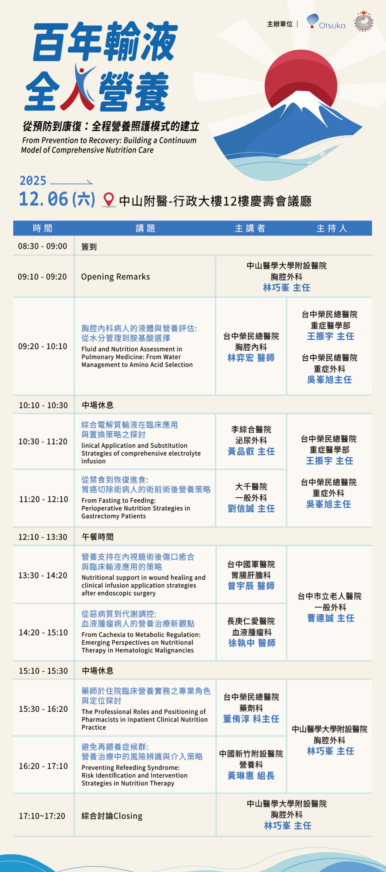 學術活動 首頁 / 學術活動 / 國內學術活動 行事曆 國內學術活動 國外學術活動 國際學術研討會補助辦法 活動報名 論文投稿 線上資源區 影音學習專區 國內學術活動 從預防到康復:全程營養照護模式的建立 活動日期: 2025/12/06 08:30 ~ 2025/12/06 17:20 活動地點: 中山醫學大學附設醫院行政大樓12F慶壽國際會議廳 返回 報名連結:https://docs.google.com/forms/d/e/1FAIpQLSeajQGJwmDnYywhwYdbUtckNUwuiB0VGpuR8joC3ITlVuqD7Q/viewform 主辦單位 台灣靜脈暨腸道營養醫學會 協辦單位 中山醫學大學附設醫院、台灣大塚製藥股份有限公司 參加對象 認定積分 本會積分:14 積分 備 註 返回