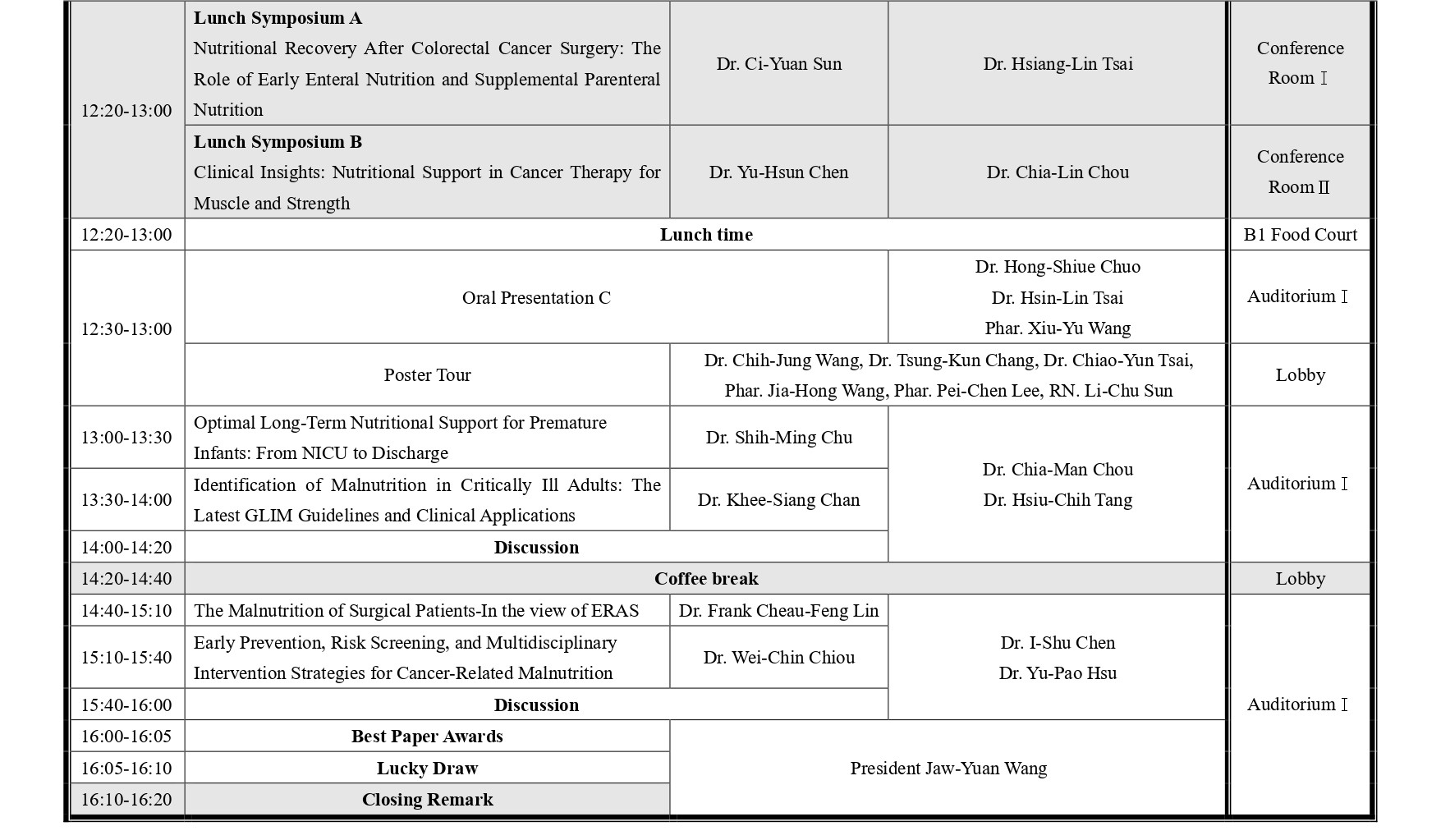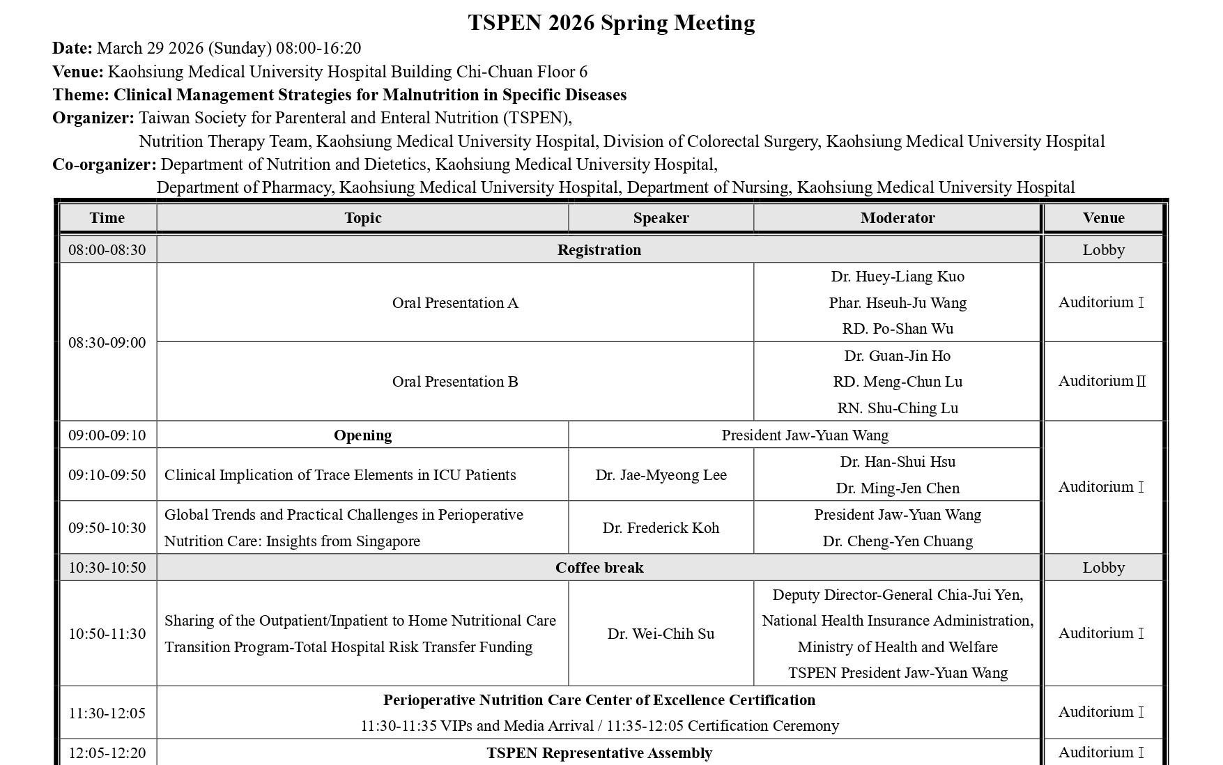| 主辦單位 | 台灣靜脈暨腸道營養醫學會、高雄醫學大學附設中和紀念醫院營養醫療小組、大腸直腸外科 |